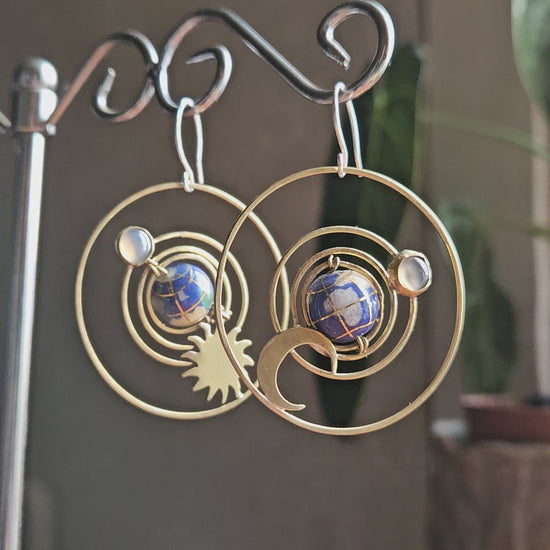 Handcrafted statement earrings inspired by the dance of the cosmos. Each piece features concentric brass circles symbolizing celestial orbits, anchored by a deep blue lapis lazuli globe that evokes our planet in miniature.