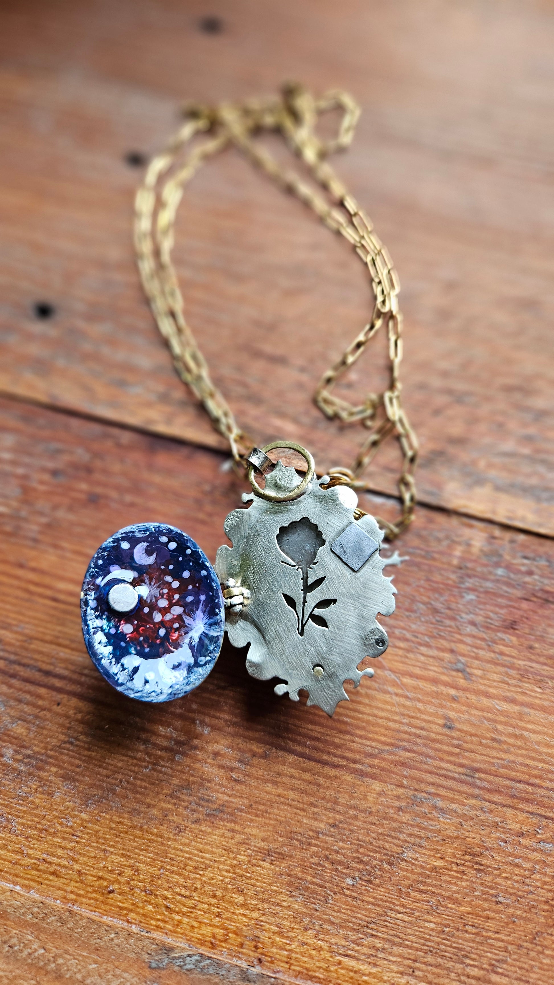 Note: This pendant is not a locket, it’s sealed, with layered metal and resin artistry