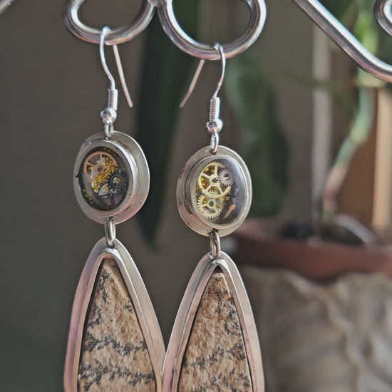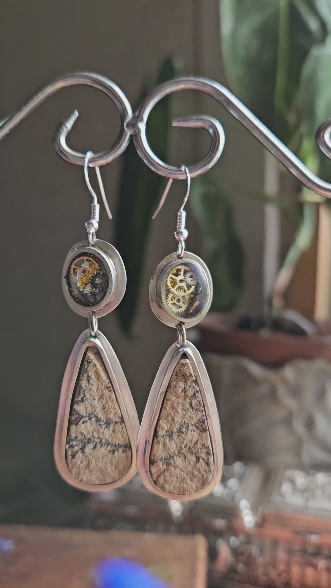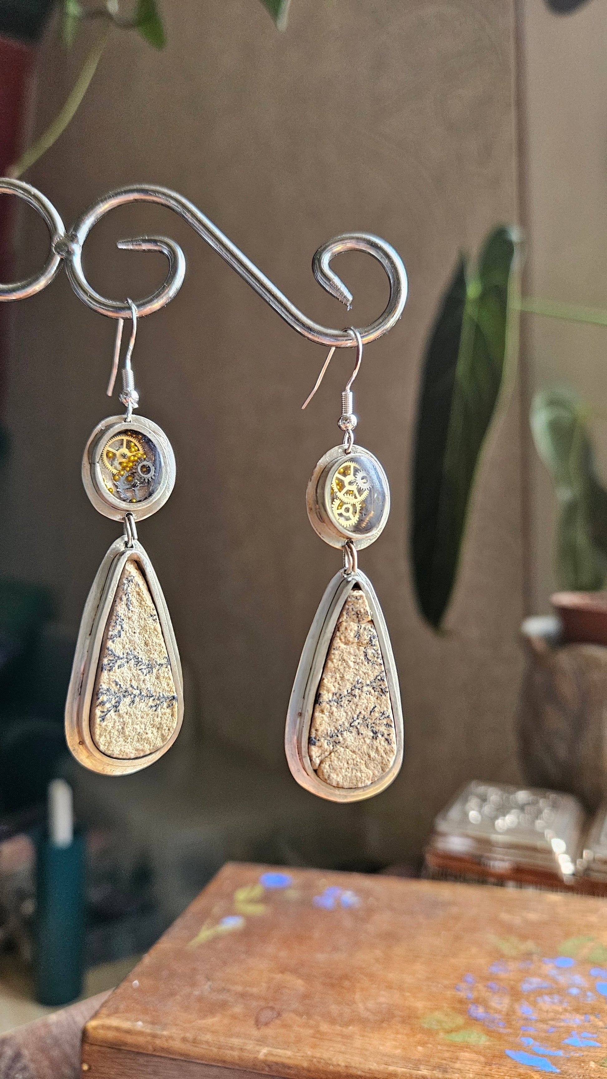 These handcrafted earrings combine earthy dendritic stone, known for its delicate, fossil-like patterns, with tiny vintage watch gears suspended in clear resin. Each piece is framed in alpaca metal (a durable, nickel-free alloy with a soft silver sheen) and finished with sterling silver ear hooks for comfortable, hypoallergenic wear.