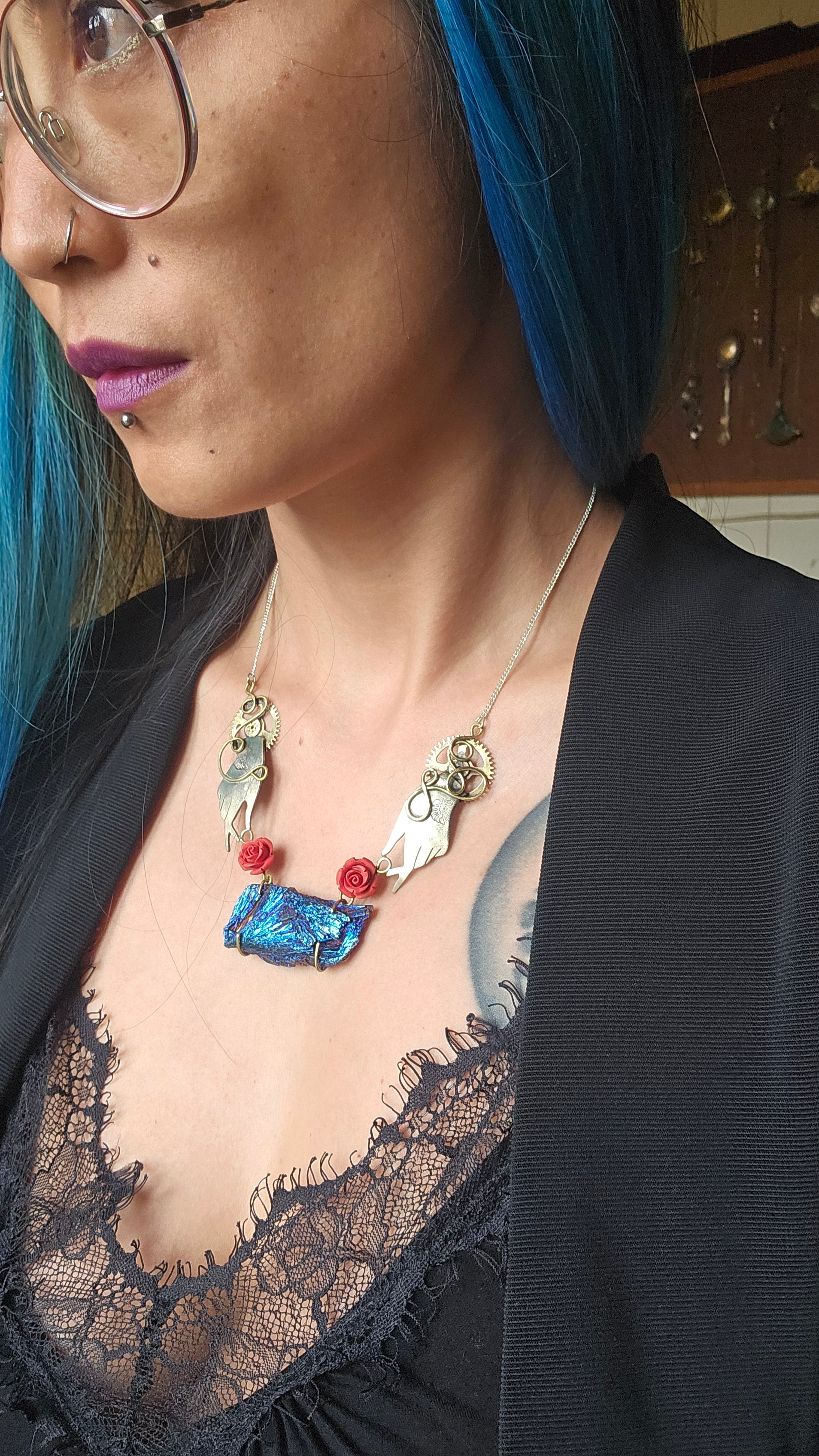 Steampunk Gothic Necklace, Electroplated Black Tourmaline with Gears & Red Roses